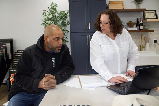 Two years after launching the business, Livingston opened a brick-and-mortar showroom in the Brookdale section of Bloomfield, just blocks from the home that inspired the company’s beginnings. Located across from the post office, the space functions as both a design center and a community hub. Curated displays allow clients to see and feel materials without being overwhelmed, while working design stations show exactly how projects come together.