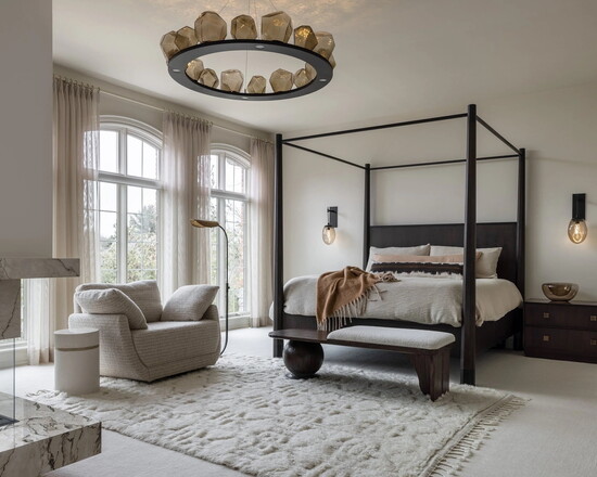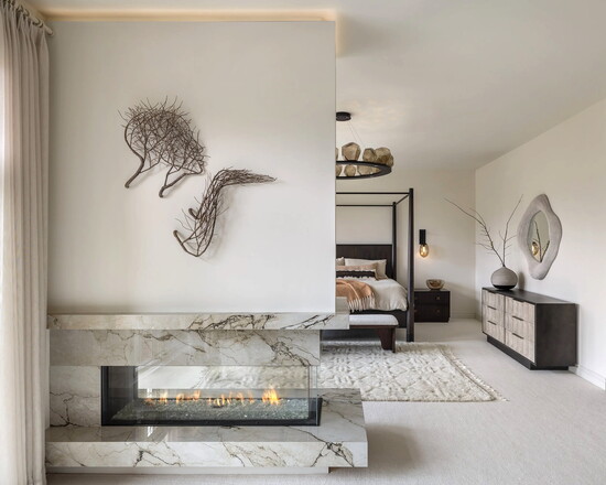 Upstairs, the primary suite became the home’s most intimate retreat. The bedroom was gutted and reworked around a new three-sided fireplace, with “places to sit,” Kasprowicz says. This included nooks for reading, unwinding or simply staying put for a while.