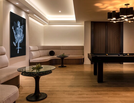 Inspired by the couple’s extensive collection of Asian art, gathered over years of travel, a former lower-level game room became a refined entertainment destination: a customized bar area and banquette seating, a wine room, billiards/games, a lounge with a fireplace for catching up and a home theater designed for serious movie nights. The goal wasn’t a showroom; it was a space that could handle the joyful wear and tear of family life, especially in summer, when guests flow in and out from the pool.
