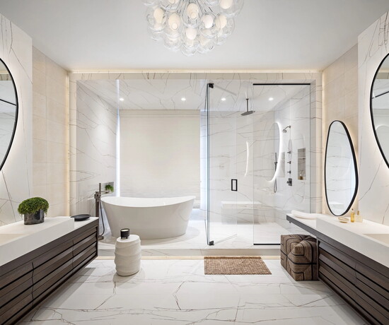 Her favorite space, and the project’s purest wellness moment, is the primary bathroom. Designed as a spa-like oasis, it layers heated floors, a steam shower, a deep soaking tub and lighting engineered for mood.