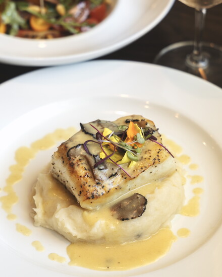 For main courses, the prime eight-ounce filet mignon features pistachio-infused pecorino, an Italian cheese with pistachio nuts. For seafood fans, the sea bass ranks among the menu's most popular items. A salad of heirloom cherry tomatoes, arugula, olives, and onions in honey Dijon vinaigrette provides a fresh counterpoint to rich dishes.