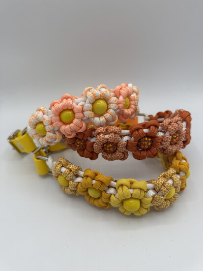 At Ericka King's shop, Colorado Cords 4 Paws, you can find handmade dog collars and leashes crafted from paracord and biothane. She began crafting leashes five years ago and gradually added collars. She loves learning and growing as an artisan at MVM.