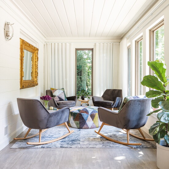 A series of oddly shaped spaces were transformed into a functional flow: the one-time kitchen became a scullery, while an enigmatic dead space is where Long created the new kitchen; a windowless screened-in porch became an expansively windowed sunroom, one of Long’s favorite rooms in the house.