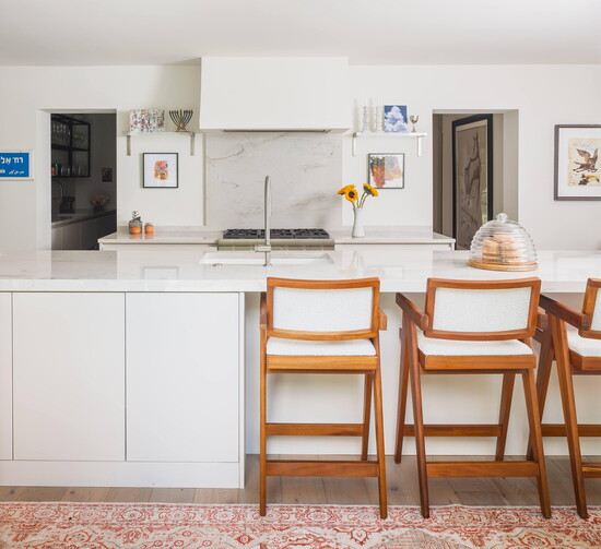 Estate-sale finds and fanciful accents like brass animal-shaped hooks in the kids’ bathroom and a pair of French bulldog figurines standing guard over the fireplace are scattered among original pieces by artists Frank Stella and Francine Turk. Judaica, including pieces from Long’s time in Israel, is displayed year-round, and kid-proof, designer-approved vinyl wallpaper and flooring lives among a biomorphically shaped sectional and chairs.
