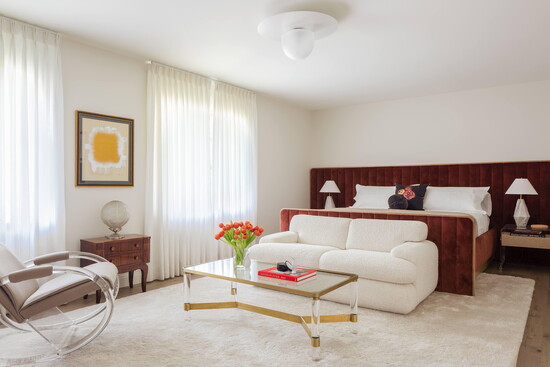 In the supremely functional galley-style kitchen, clean-lined white cabinetry and marble surfaces are softened with warm wood accents and vintage textiles. Living and dining spaces feature sculptural seating, streamlined built-ins; bathrooms balance classic geometry with modern restraint, using pattern and texture to create subdued interest.