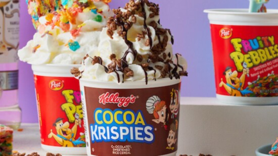 Step 1. Put cereal in blender or food processor and blend to a powder. Fill a Cocoa Krispies cereal cup to the top with ice.