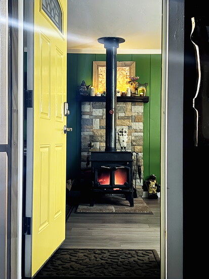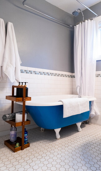 Influenced by their love of wildlife and nature, Chris and Jennifer decorated the space to truly reflect its surroundings with original works of art and a few fun surprises. “We have a late 1800s Royal Charter Oak wood cooking stove in the kitchen, which has become a coffee and tea bar, and a beautiful blue antique clawfoot soaking tub in the bathroom,” says Jennifer. “The wood burning stove in the main room is also the perfect place to warm up after enjoying the outdoors.”