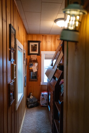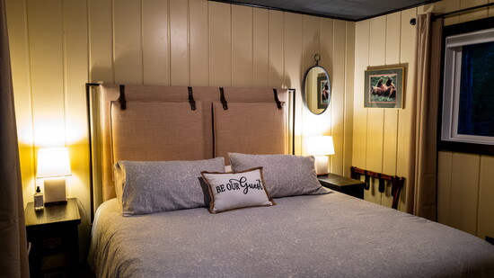 The cabin’s second bedroom has a theme that resonates with children and wildlife lovers. “When I saw the bedroom, I thought it looked like a bear’s den, so it is decorated to be Smokey Bear’s den. We say that it’s Smokey’s den that he uses, but when he's not here, he lets the kids, or the young at heart, sleep in it,” shares Jennifer. “It has a log cabin bunk bed and on the wall are pieces of Smokey’s life, like his fire school graduation certificate, a photo of when he met the Queen, and a picture of Smokey getting a presidential medal.” Behind the cabin sits a small clubhouse designed to be a special retreat for children or adults and houses a big screen tv, games, puzzles, and space for overnight stays.