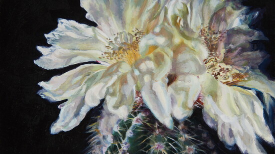 Moghbel’s most recent work focuses on prickly pear cactus flowers. Following a challenging time in her life, she chose the cactus flowers because she was trying to channel the resilience and endurance of the plant. The bloom of the cactus flowers became a symbol for her during the painting process. Moghbel noted that the cactus flowers don’t look like much in the winter, but the blooming season is worth the wait.