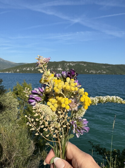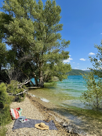 I have a rule of leaving large gaps in my agenda when traveling. I want to be able to ask locals once I am there what their favorite places are. I want to be able to turn down a road that looks particularly beautiful or make a pit stop for a photo or road side farmers market. I want to be open to whatever curiosity or happenstance the universe throws my way. And so when we first visited Riez in the Alpes-Haute-Provence region of France that's exactly what I did. We had four days with the only things on the agenda - check into our bed and breakfast and hike at some point. This flexible schedule ended up being the best decision, as the bed and breakfast owner, Geraldine, gave us her recommendations on where to eat, secret spots to enjoy the lake, and lavender fields not bustling with tourists. We also found out that market days in Riez were on Wednesday and Saturday, so we got to live like a local and peruse the freshest most beautiful produce and food the region had to offer. And after our few days in Riez, it was time to go, but something was different about this tiny treasure of a town and I knew I would be back. So the next year I returned for longer, and then again in 2022 and 2024.