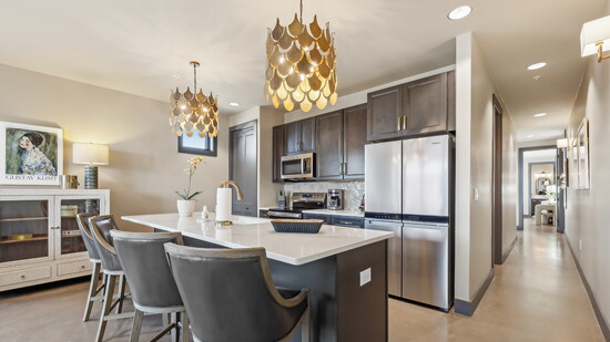 The design process for these condos began in February and continued through October 2024, resulting in a timeless space with a modern twist. Interior designer DeAnna Dodd of DeAnna Dodd Designs focused on high-end style and comfort. Unit 200, a one-bedroom, is light and airy with soft tones and luxurious touches, including a king-size black spindle bed and marble Gabby chandeliers over the island. In contrast, Unit 201, a two-bedroom, has a moody, masculine vibe with antique gold fixtures, dark furniture, and eclectic artwork. Lighting played a key role, with Mercana and Gabby metal chandeliers in Unit 201 and marble chandeliers in Unit 200.