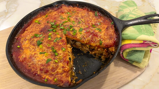 2. In a 12-inch cast iron skillet, spread ¾ cup of enchilada sauce on the bottom. Layer 4 tortillas on top, followed by half of the chicken mixture and ½ cup of cheese. Add ¾ cup of enchilada sauce on top.