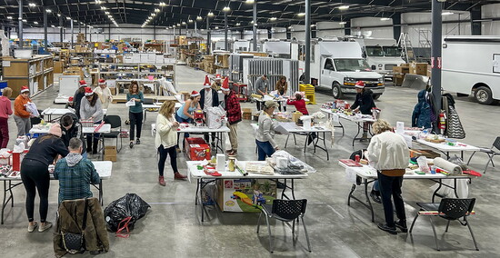 In early December, volunteers gather for wrapping night. The scene is one of joyful chaos: long tables piled high with rolls of red and green paper, ribbons curling under scissors and tape disappearing as fast as volunteers can grab it. Laughter echoes as strangers bond over bows and gift tags. By the end of the night, the wrapping space is stacked with boxes, each labeled for a specific family.