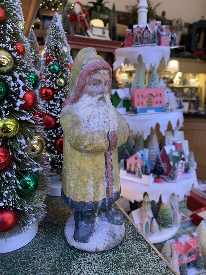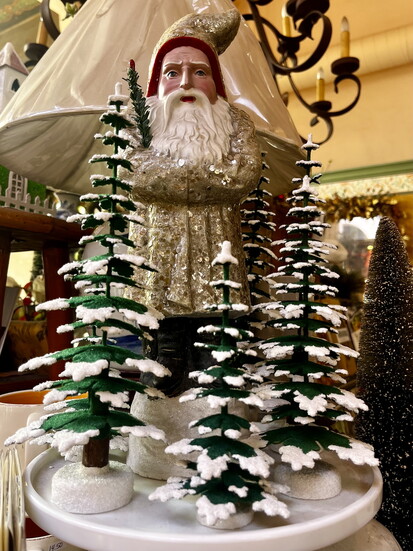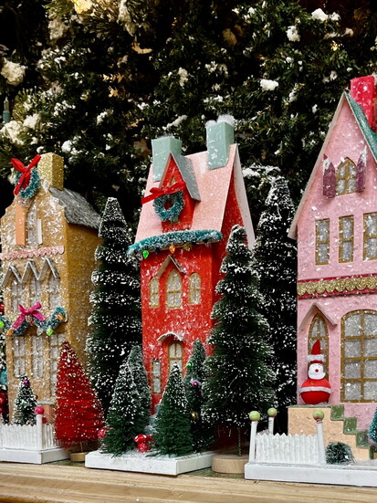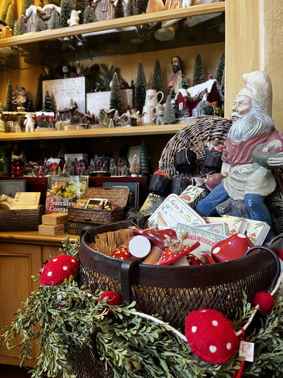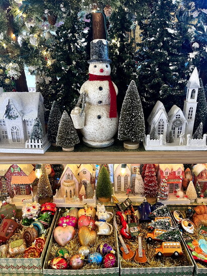 The shop doesn’t just put up decorations—it creates atmosphere. Garlands drape across antique hutches. Ornaments glitter from every corner. Classic nutcrackers stand tall next to delicate glass baubles. Tiny houses with glowing windows invite you down snowy cobblestone streets.