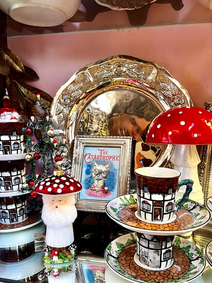 There’s also everything you need to create a stunning holiday table. Vintage silverware gleams beside holiday napkins and elegant dinnerware. You could easily build a holiday tablescape from pieces in this shop.