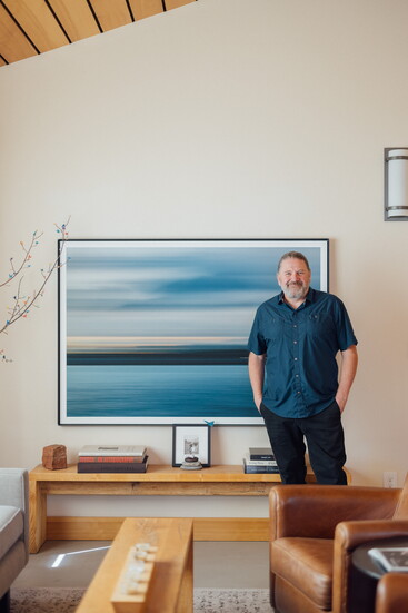 "This is the view from the home of good friends I was staying with in Maine. I made this Chromascape of the ocean at sunrise to remember the beauty and light of the place––the time shared with friends. A large print of Chromascape 142 hangs in their home now. I also love that they took this photo of me while I was making my images that morning,” shares McClish. “I think of art as a shared experience rather than transactional. It’s an incredible honor to be invited into someone’s home to create a piece of art they will hopefully live with forever.”