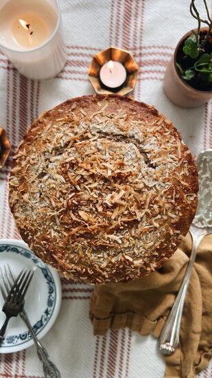 - Grease a small pan or skillet with the coconut oil. Pour the batter into the skillet and top with a little more shredded coconut. Bake for 45 minutes, or until a toothpick comes out clean.