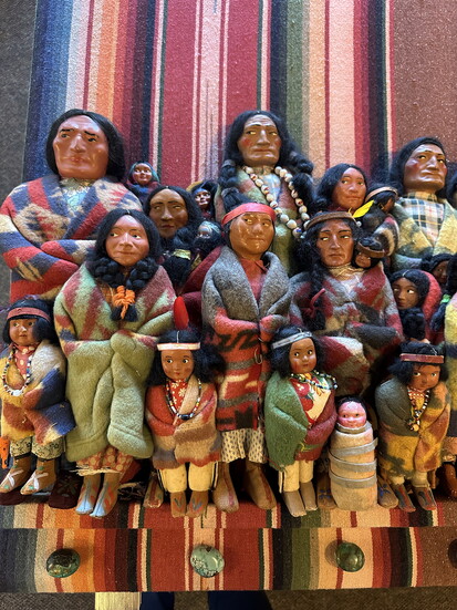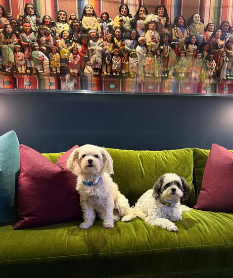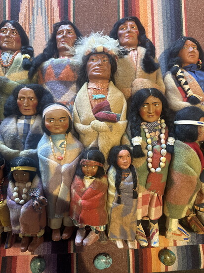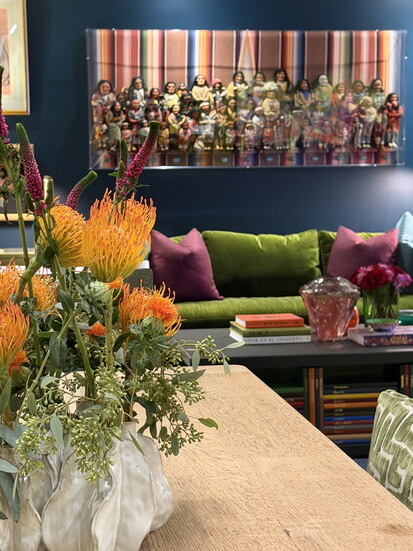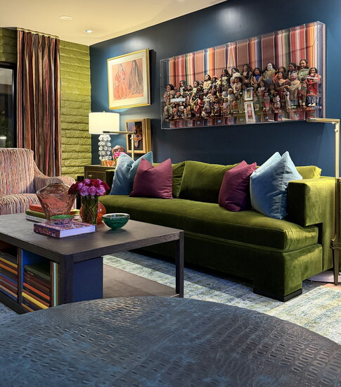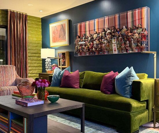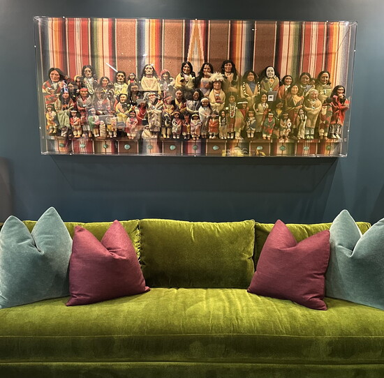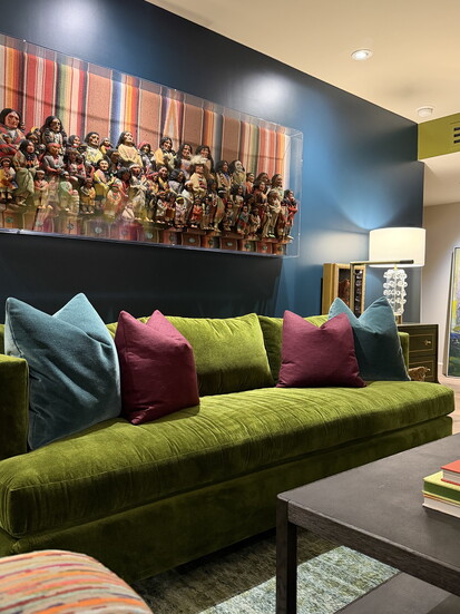 The grounding piece of art for the entire home was a custom piece Schell designed, combining a seven-foot Plexiglas case, dozens of Native American Skookum dolls, a colorful Serapi blanket and turquoise embellishments.