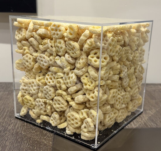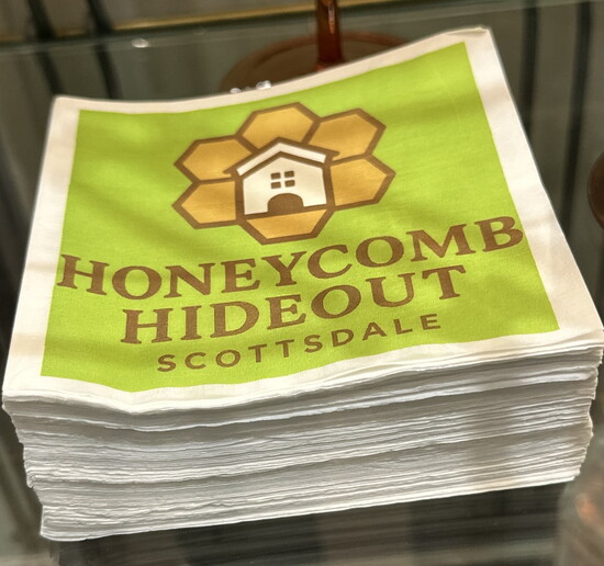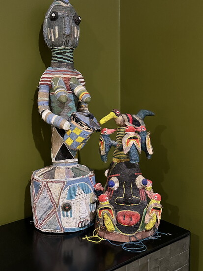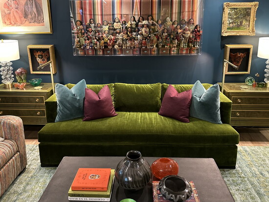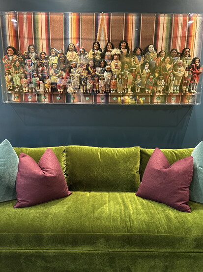 There is the honeycomb tile in the bathroom and a Plexiglas box filled with Honeycomb cereal, a nod to the “Honeycomb Hideout” name. The Pierre Frey floral chair that Schell refers to as “a piece of art” and the green velvet custom sofa, sitting beneath the Skookum doll installation.