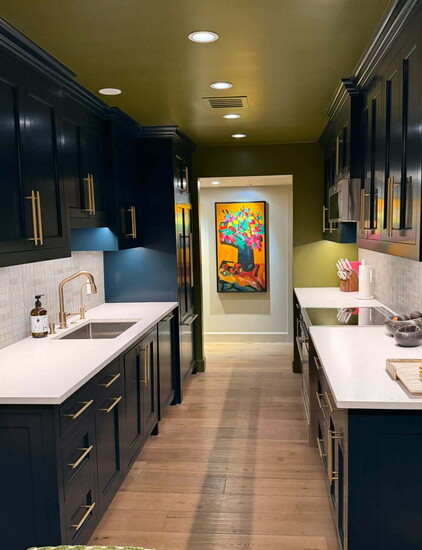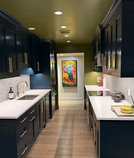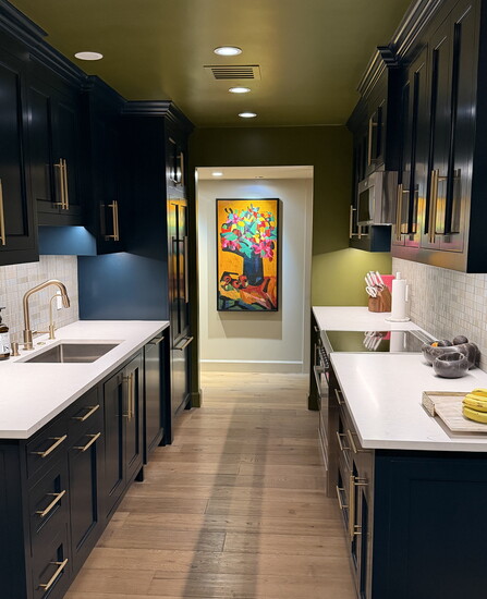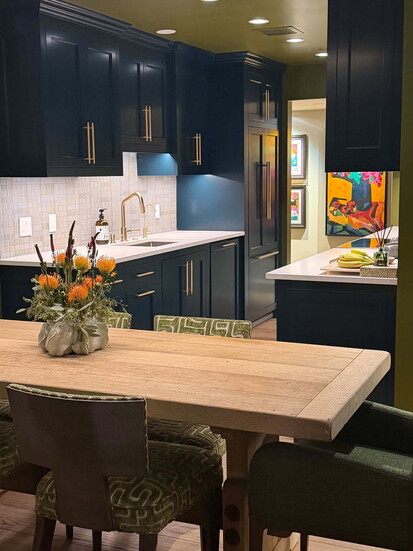 Color choices were essential to Schell. He chose to paint the family room Sherwin-Williams Saguaro, a warm cactus green, perfectly mirroring the Southwest setting. In the kitchen, he chose Sherwin-Williams Dark Night to add visual interest to the space and repeated the blue used on the cabinets on the family room wall.