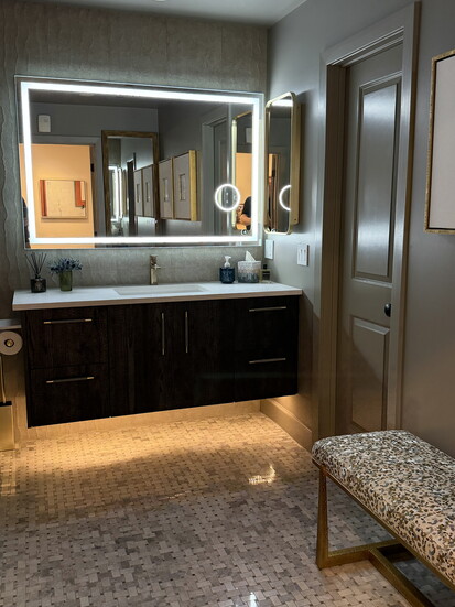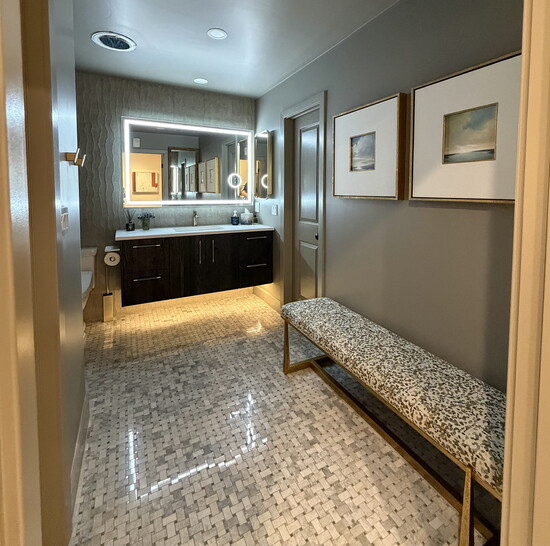 On the renovation side, Schell spent months working closely with 4D Construction in Scottsdale, led by Rocky and Katie Dinis, whose craftsmanship and collaboration made every detail possible. All three bathrooms were taken down to the studs and rebuilt with stunning tile, custom cabinetry sourced in Scottsdale, and barrier-free showers for aging-in-place accessibility. The kitchen was opened by removing a wall, allowing for circular flow and connection to the rest of the home.