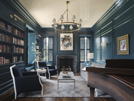 Other thoughtfully designed spaces include a richly detailed library, a stair hall with a dramatic flair, and a powder room and secondary bath finished with heavily veined Italian marble. Marble, he explains, is a material historically favored in classical homes for its natural movement and character.