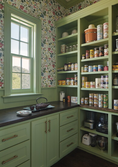 In additional spaces, such as the pantry, he states that the wallpaper was carefully chosen to echo traditional patterns and textures, reinforcing the Greek Revival narrative while adding depth, warmth, and a sense of permanence.