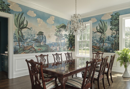 “A defining layer of the home’s design is its use of historically inspired wallcoverings,” says Alan. “The dining room features a French mural wallpaper by Papiers de Paris, depicting a classical landscape scene inspired by Telemachus on the Greek isle of Calypso. Rendered with depth, movement, and restraint, the mural feels less decorative and more architectural—evoking the kind of hand-applied papers found in historic European estates.”