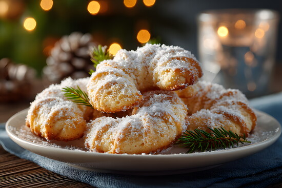 Spread powdered sugar on a hard surface and roll out dough balls very thin. Spoon 1/2 tsp of filling onto dough round and roll dough up around it, pinching ends to form a crescent shape. Place on undressed cookie sheet. Bake at 375 degrees for 8-10 minutes. Remove and cool. Sprinkle with powdered sugar.