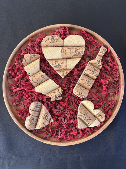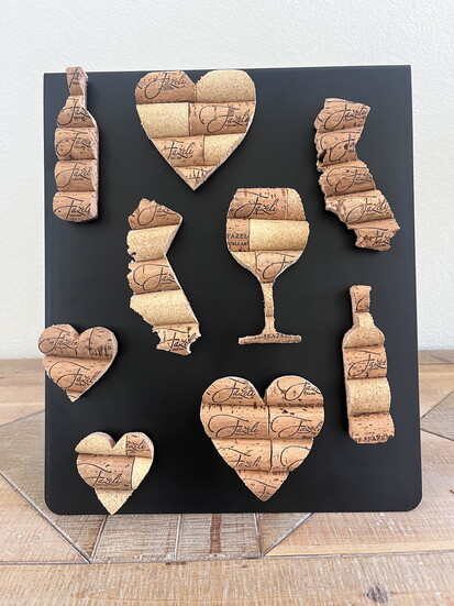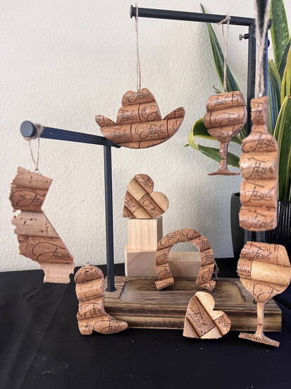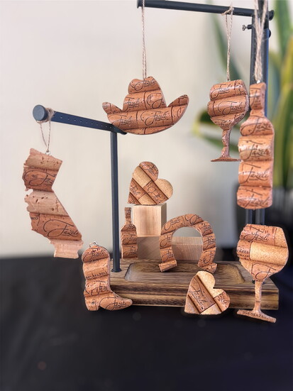 Each piece is handcrafted, shaped into hearts, wine bottles, glasses, and even California silhouettes. These designs don’t just decorate — they tell a story. Every cork carries the memory of a shared toast, a celebration, or a quiet evening, and Isabel repurposes them into timeless keepsakes.