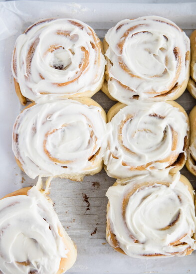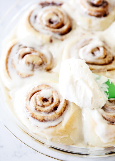 Roll dough into a 15×20-inch rectangle, spread with softened butter, and sprinkle with mixed cinnamon and brown sugar. Roll tightly from the short side and cut into 12-16 pieces. Place on a lined baking sheet, cover tightly, and refrigerate up to 16 hours. In the morning, let rise 1-2 hours, then bake at 350°F for 15 minutes. Beat frosting ingredients and spread over warm rolls.
