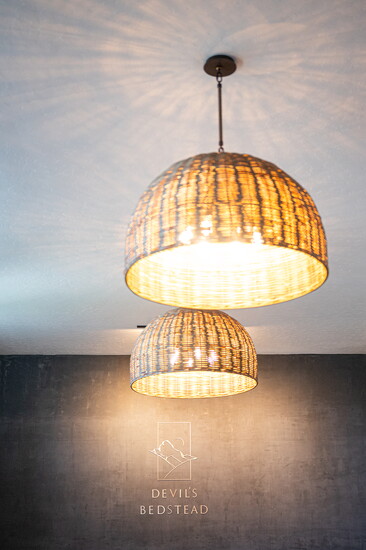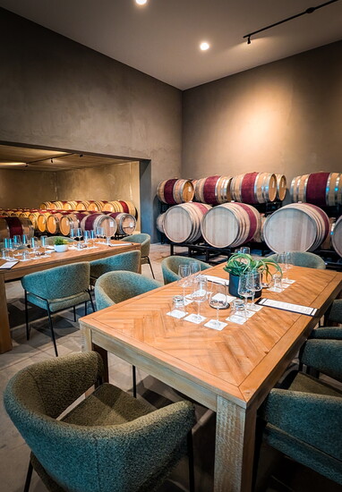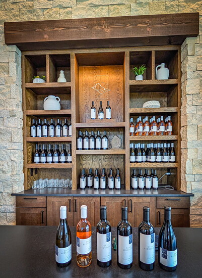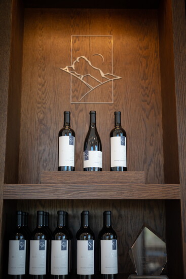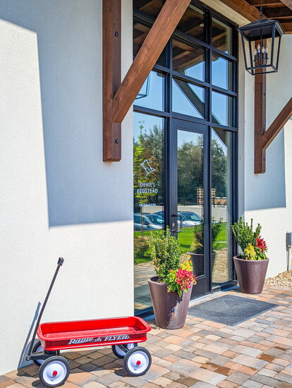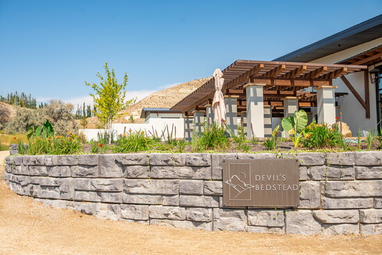 Tucked just behind its elder sibling, Devil’s Bedstead winery adorns a name and symbol adopted from a lesser-known mountain peak in the Pioneer Mountains reflects Greg’s childhood spent in Ketchum, Idaho. It’s familiar Italian-inspired exterior hosts wooden lattice pergolas, stonework and a grand mirrored-window entrance. An alluring fragrance of wine greets visitors who step inside the intimate atmosphere of minimalist warm earth-tones accenting concrete floors and vaulted ceilings adorned with beautiful basket-woven pendants. Framed wine labels designed with artwork from their children’s grade school and some of Greg’s original architectural drawings add personal touches to the main room while windows give glimpses into the second tasting room where visitors can sit cozied up in warm, fuzzy blankets amongst the wine barrels for a tasting of reds and whites.