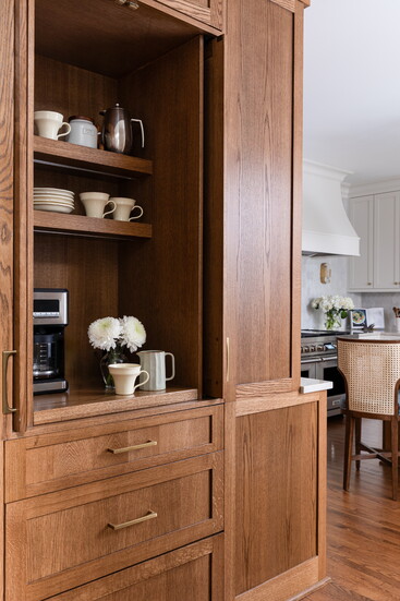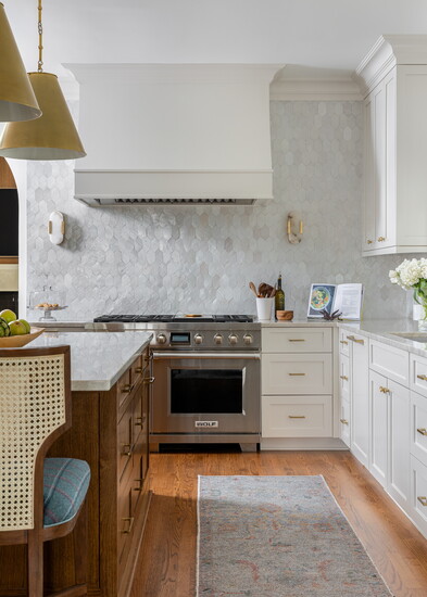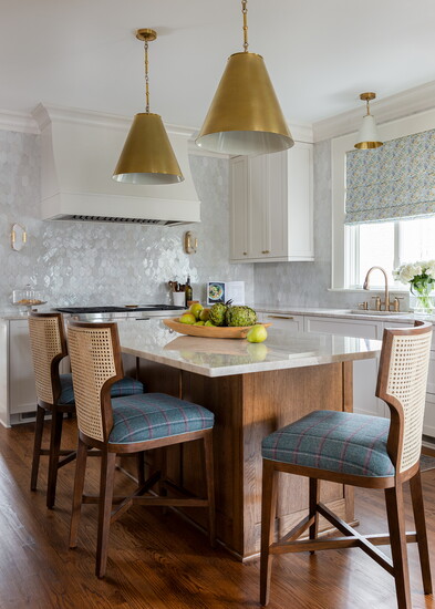 “We love that they have the natural caning detail with the stained wood perimeter because that really ties into our cabinetry color,” Quisenberry says. “It brings the warmth up to eye level.”
