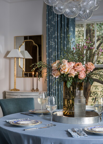In the dining room, Quisenberry matched Aegean blue from the painted cabinetry in the family room with modern, floral drapery vegan-leather upholstered chairs by Charles Stewart, which are wipeable with a sponge.
