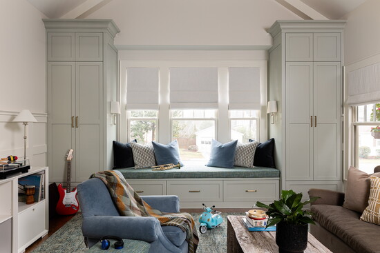 Perhaps the most functional space in the house used to be the husband’s office, located by the front door. Quisenberry converted it into a kids’ “flex” space, which is part drop zone, part homework space, part hangout room. Behind the cabinet doors are cubbies for kids' coats and bookbags.