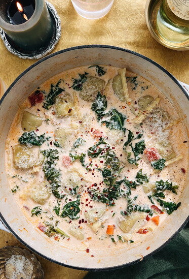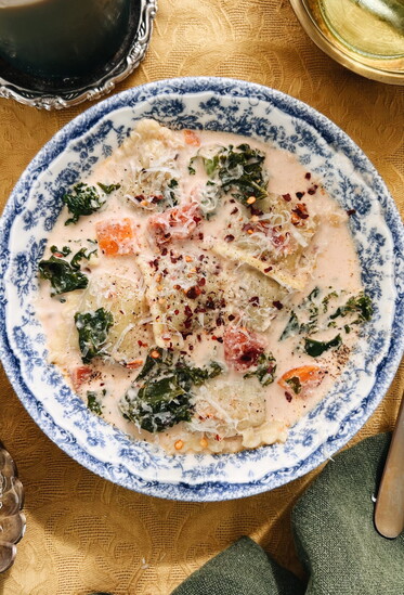 - Add the ravioli and cook under a simmer for about five minutes, until they soften and plump. Add the kale to wilt, then squeeze in the lemon juice.