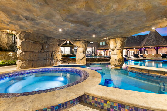 “It’s the most phenomenal project I’ve ever seen,” says Chris. “The space was designed for entertaining, featuring an expansive outdoor kitchen and bar, along with a dramatic cave that houses a spa, in-water dining and seating areas, a built-in kitchen, and multiple televisions. Above the cave is a fire pit with additional seating, as well as a slide that leads directly into the pool. Walking out of the master suite, there’s a private spa that spills into a river flowing into the first pool, then cascading into a second pool. It’s truly incredible.”