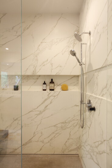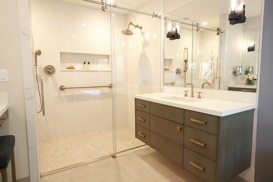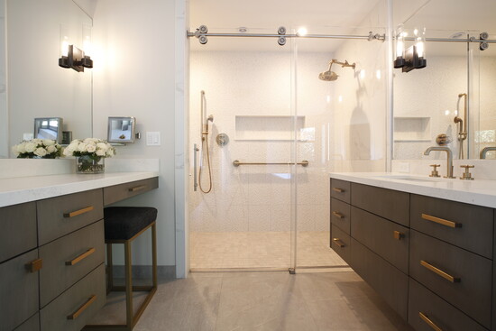 Also, consider going curbless. It is not only a sleek, modern aesthetic but also a smart choice for aging in place.