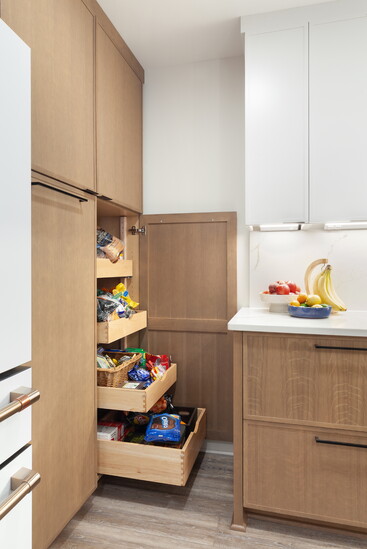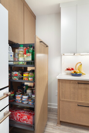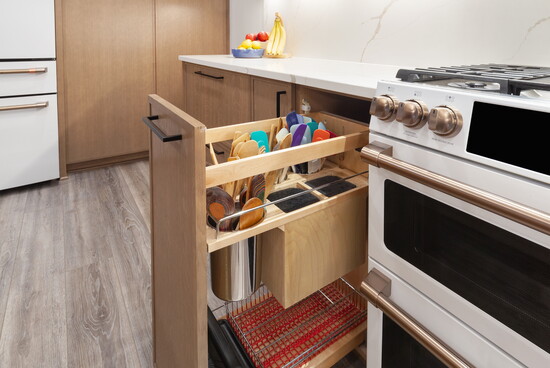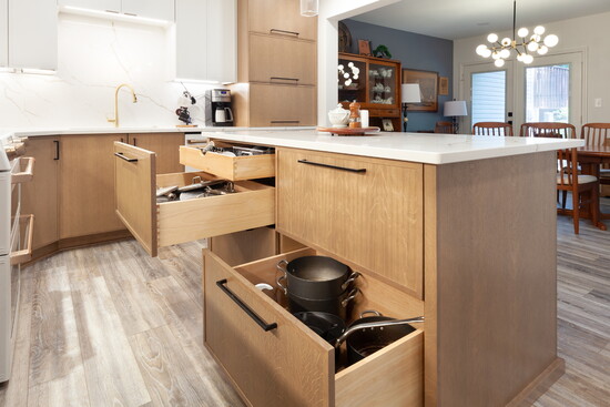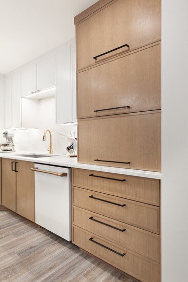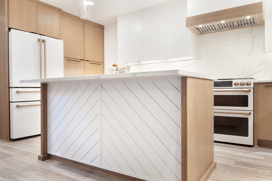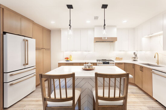 Inspired by the clients’ love of bright, airy spaces and clean Scandinavian lines, the new design features GE Café appliances in matte white with bronze pulls, paired with Omega cabinetry in quarter-sawn white oak and painted finishes. MSI Calacatta Laza Oro quartz counters and a full-height backsplash complete the look, while copper-toned accents tie everything together.