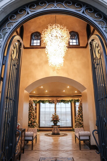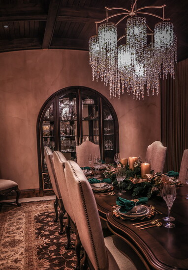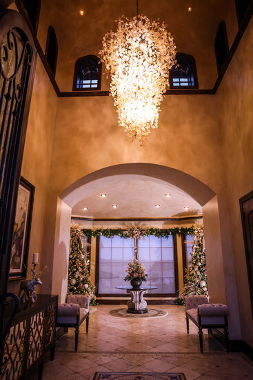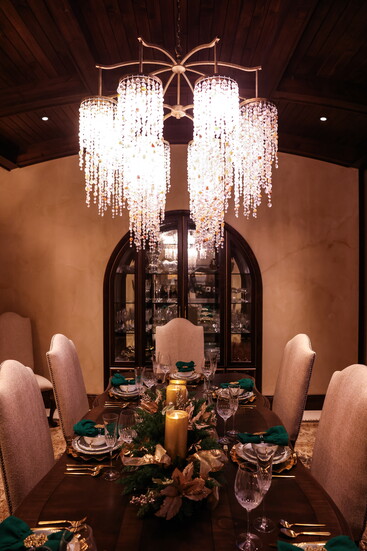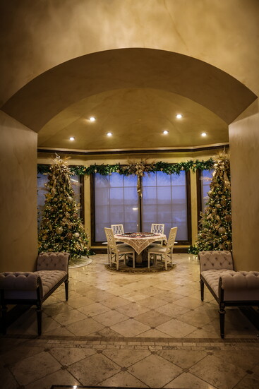 Stepping into the Illig home feels like being wrapped in a welcoming embrace. The entryway, filled with natural light and rich architectural details, sets a tone that is both elegant and inviting. “We wanted the entryway to feel like an embrace, sophisticated, warm, and elegant,” Michelle explains. “The softly lit pair of Christmas trees sets the tone, elegant, sparkling, and softly glowing. It’s a perfect welcome that can be enjoyed both visually and socially as we sit around the table with friends.”