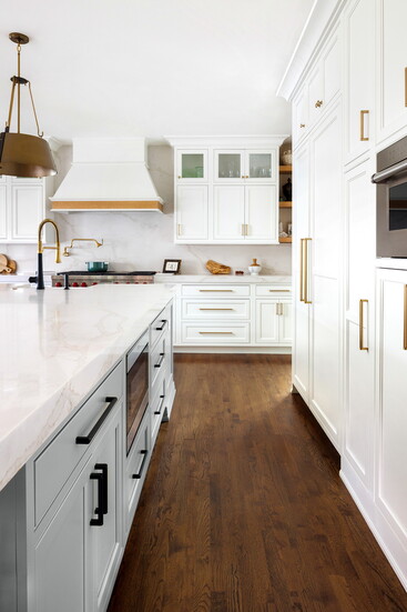 Material choices lean toward quiet luxury. Quartzite countertops paired with full-height, seamless backsplashes remain a standout, creating continuity and visual impact. Workstation sinks with built-in accessories support efficiency, while farmhouse sinks continue to add warmth and familiarity. Hardware and faucets in brushed or patinated brass, matte black, or soft gray tones add subtle contrast, complemented by layered lighting and lighter-toned hardwood floors that ground the space naturally.