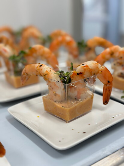 - Place two seasoned shrimp on opposite corners of the cup with the tail ends facing out and down. Garnish each shrimp with a cilantro leaf.