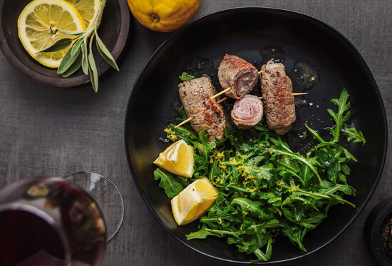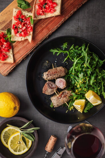 - Roll up slices and secure each roll with a toothpick. Season with cracked black pepper.