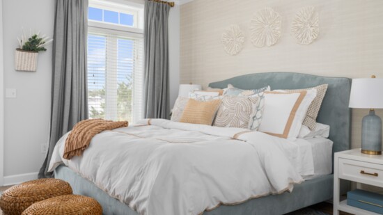 Personalizing your environment starts with understanding your individual style preferences. Whether you gravitate towards flowing curves or clean, straight lines, or favor light shades over deep tones, these decisions define the atmosphere you aim to create. By evaluating these elements, you can identify the design aesthetic that best mirrors your personal taste. When beginning the design of a room, it’s most effective to start with the largest piece, such as the bed in a bedroom or the sofa in a living room. This foundational element sets the tone for the entire design. In this coastal-inspired design, we selected a soft blue upholstered headboard with modern straight gold metal legs. The choice of blue influenced the selection of accessories like the rug, lamps, and drapery, while the gold influenced the hardware of the furniture, wall mirror, and ceiling fan. To maintain a bright atmosphere, we opted for white furniture, complemented by textured bedding and wicker ottomans. Adding a pair of faux palm trees completes the space, framing it with a coastal charm.