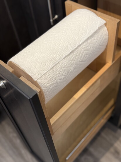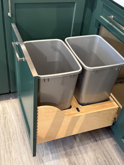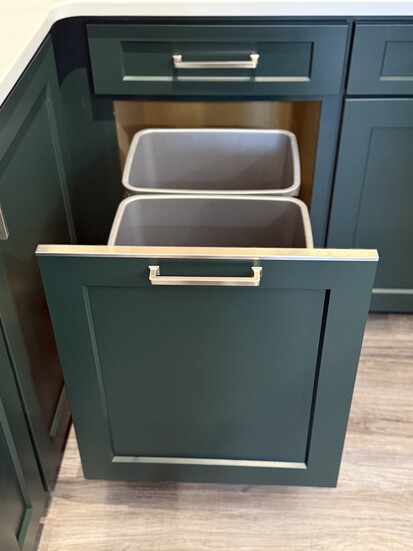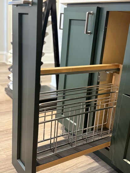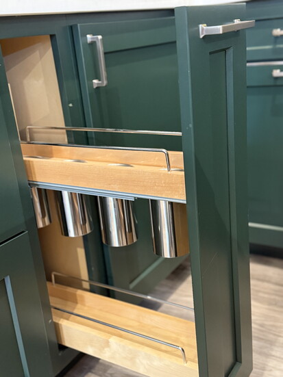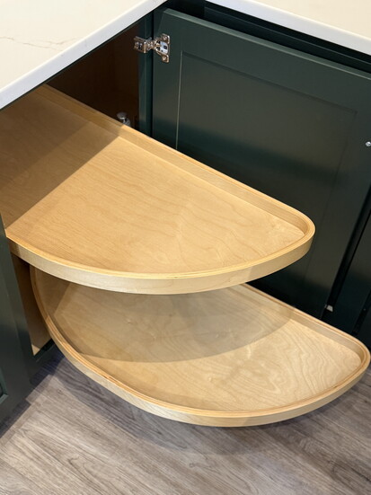 2. Blind corners: Instead of a traditional lazy Susan, they install a half-moon swing-out (or other storage options). The single door is much more durable than a piano-hinged lazy Susan door.