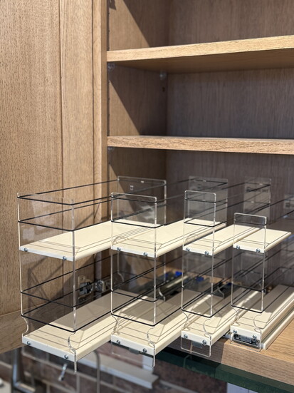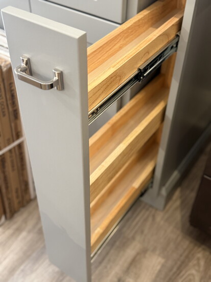 3. Adjustable roll-outs: These go in either base cabinets or pantry cabinets. It allows you to set the height on your roll-outs. You just pull them out, and they click back in!