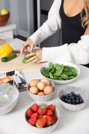 Her grocery haul also includes yogurt, frozen fruit, protein bars, and a salad box of spring mix or spinach and arugula. She keeps some raw veggies and apples on hand for snacks. She also has protein snacks that are easy to grab and go, like her favorite protein powder to throw in a shaker bottle or a protein bar.