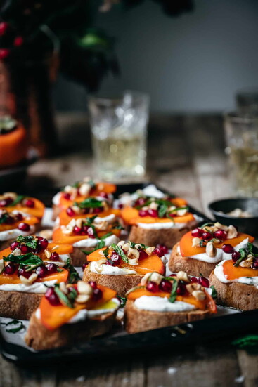 - Top the crostini with whipped cheese, a slice of persimmon, pomegranate seeds, chopped nuts, more mint, a drizzle of olive oil and a light sprinkle of salt and pepper.