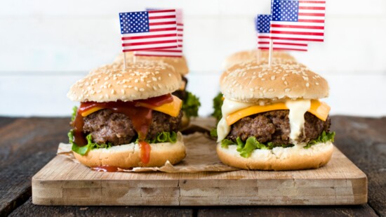 2: While burgers are cooking, cut bacon strips in half. Take 4 pieces of bacon and create bun-sized bacon weaves.