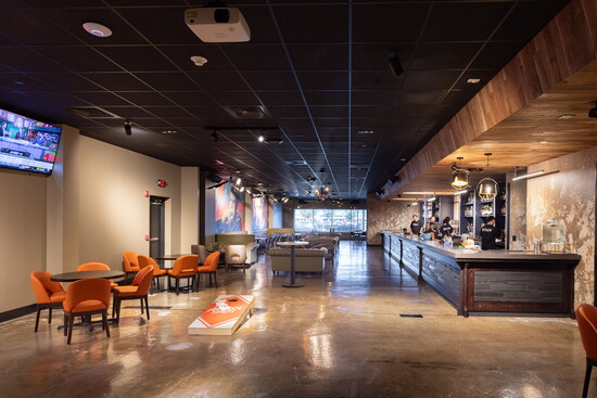 Inside, the massive space is vibrant and electric, with something for everyone. The beer hall, with its warm wood finishes, earthy tones, and metal chairs offers a comfortable atmosphere. A long bar with large screens lists the day’s craft beer lineup and other drinks on tap. Clusters of TVs hang from the ceiling so sports fans can catch the game from any seat. A stage in the center of the room hosts live bands and DJs on weekends.